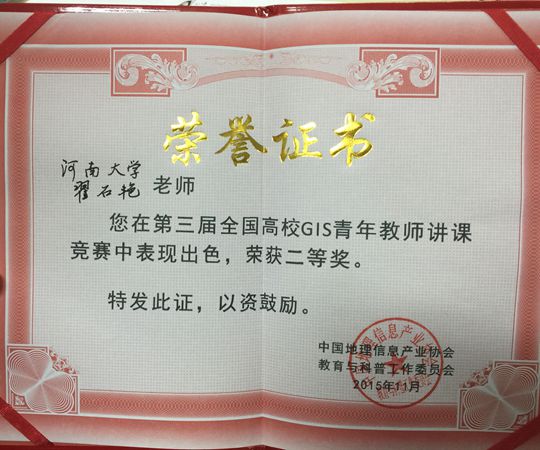 2015年11月9日,第三届全国高校GIS青年教师讲课竞赛在华东师范大学闵行校区隆重举行,大赛吸引了包括中南大学、beat365 手机版官方网站、西北大学、湖北大学、解放军信息工程大学等35所高校,共57支代表队,总共225人参加。我院青年教师翟石艳参加此次比赛,并荣获二等奖。