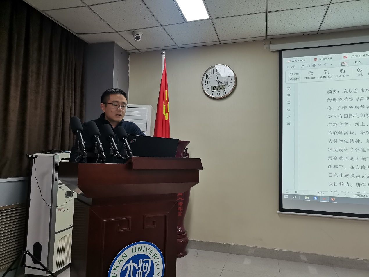 丁志伟解读了全国高校教师教学创新大赛的比赛规则和要求,介绍了本次大赛举办的意义和教师教学创新大赛的内容要求,分享了两个在教学创新领域具有显著成效的优秀案例。接下来,韩冬等五位老师依次汇报了他们的课程创新报告与教学设计。