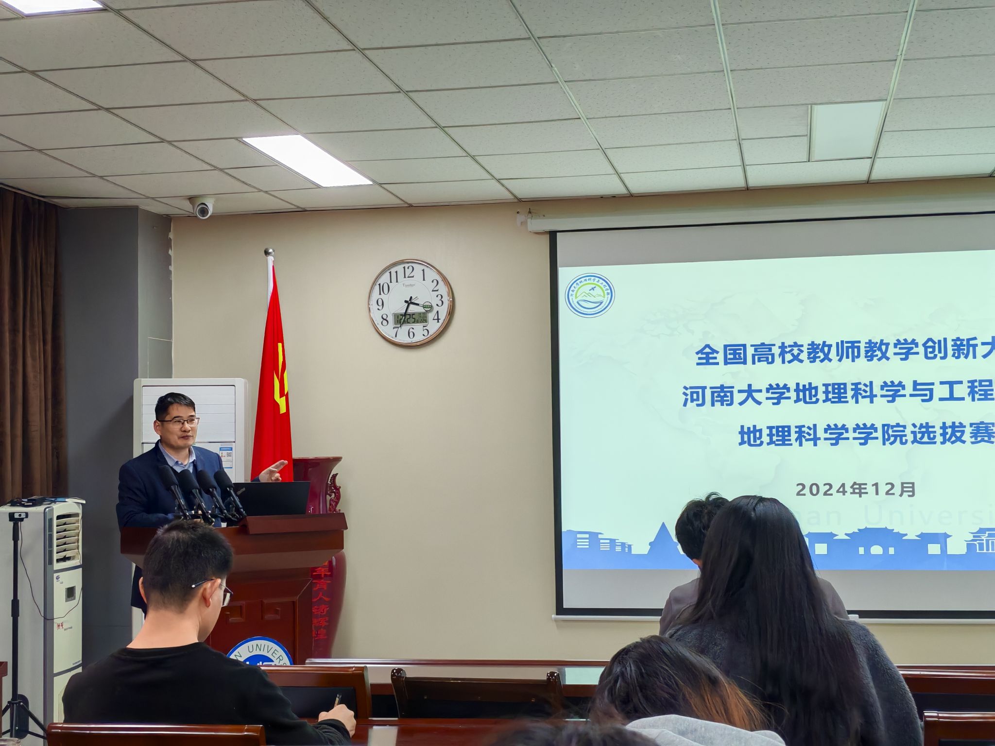 为进一步提高教师教学的课堂创新水平、教学技能水平与课程的体系化设计,根据《beat365 手机版官方网站关于全国高校教师教学创新大赛校内选拔赛的通知》的安排,学院在地学楼二楼报告厅举行了全国教师教学创新大赛院内选拔赛。本次大赛由学院教务办主任刘德新主持,副院长丁志伟、地理科学系主任李开封、区域与城市科学系主任翟彬等师生参与了此次活动。