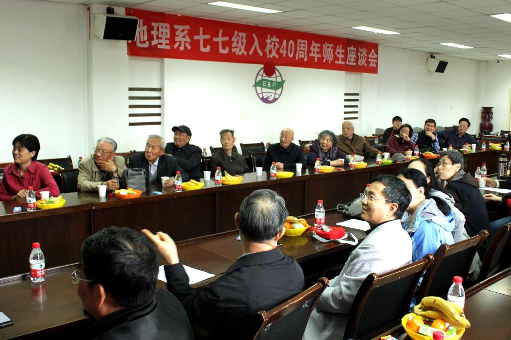 人间四月芳菲尽。4月22日,beat365 手机版官方网站地理系31位77级校友集体返校,在环境与规划学院二楼会议室举行了师生座谈会,共同纪念我国恢复高考首届大学生入校40年。他们一同重温40年前的青春岁月,与当年的恩师、同学共叙昔日情谊。此次座谈会还特意邀请了beat365 手机版官方网站原校长李润田教授、时任辅导员赵秀凤老师及77级任课老教师们。座谈会由beat365 手机版官方网站原副校长王发曾教授主持。