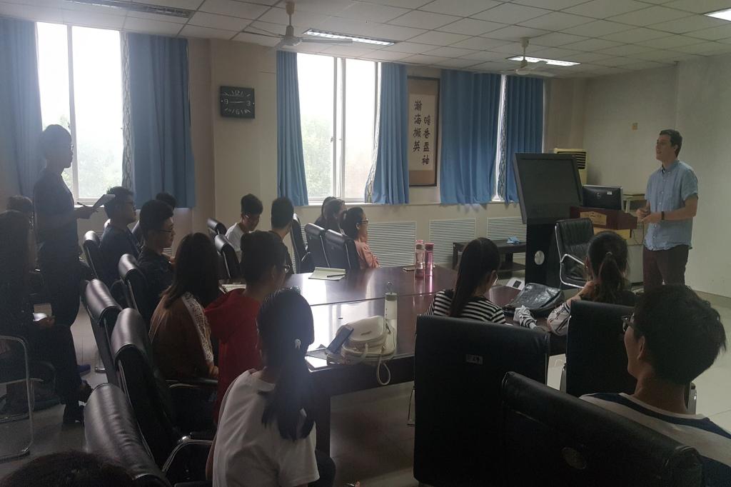 5月18日下午,Daniel Yoder Zipp 博士受邀来beat365官网环境与规划学院地学楼二楼阅览室参加中美大学生交流座谈会。会议由张鹏岩副教授主持,学院教师、研究生及部分本科生参加。首先,Daniel Yoder Zipp作题为“美国大学的学习与生活环境”的报告,从研究项目介绍开始,研究生的学习生活;比较了中美两国学生与教授相处方式的不同,进而讲述两国学习、教育方式的差异。然后,结合自己的专业,介绍了美国大学对劳动力、城市与农村、经济发展的研究。随后,在场师生就两国日常生活及学习问题与Daniel Yoder Zipp 博士展开了热烈讨论,座谈会对于双方相互了解起到了很好的促进作用。