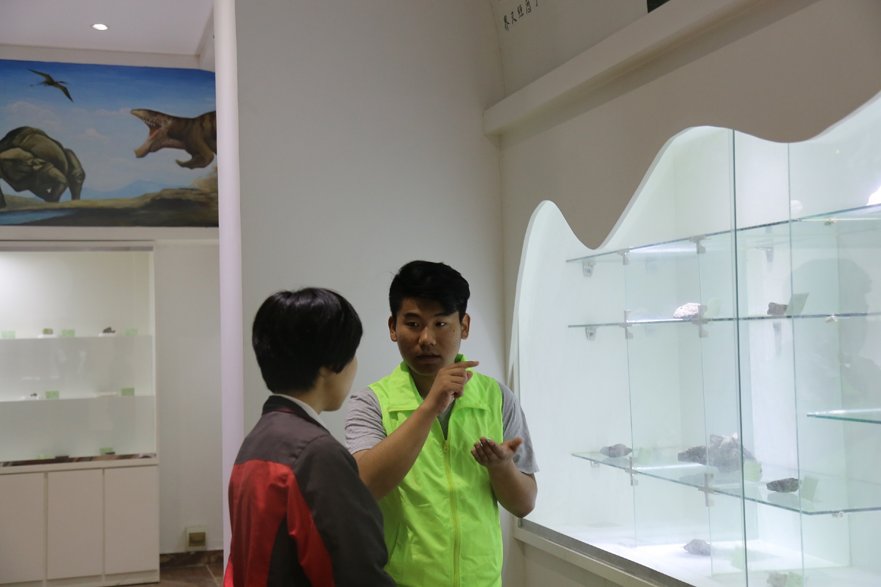 在附中老师的带领下,同学们井然有序地到馆内参观。志愿者带领同学们从古植物到古生物再到岩石、矿物等进行逐一介绍。同学们看到馆内各类精美的展品纷纷驻足观望,并积极询问它们的成因,志愿者们用通俗易懂的语言让同学们了解了各类岩石的转化过程和它们在日常生活中的应用。通过志愿者幽默的解答极大地提高了同学们的学习兴趣。