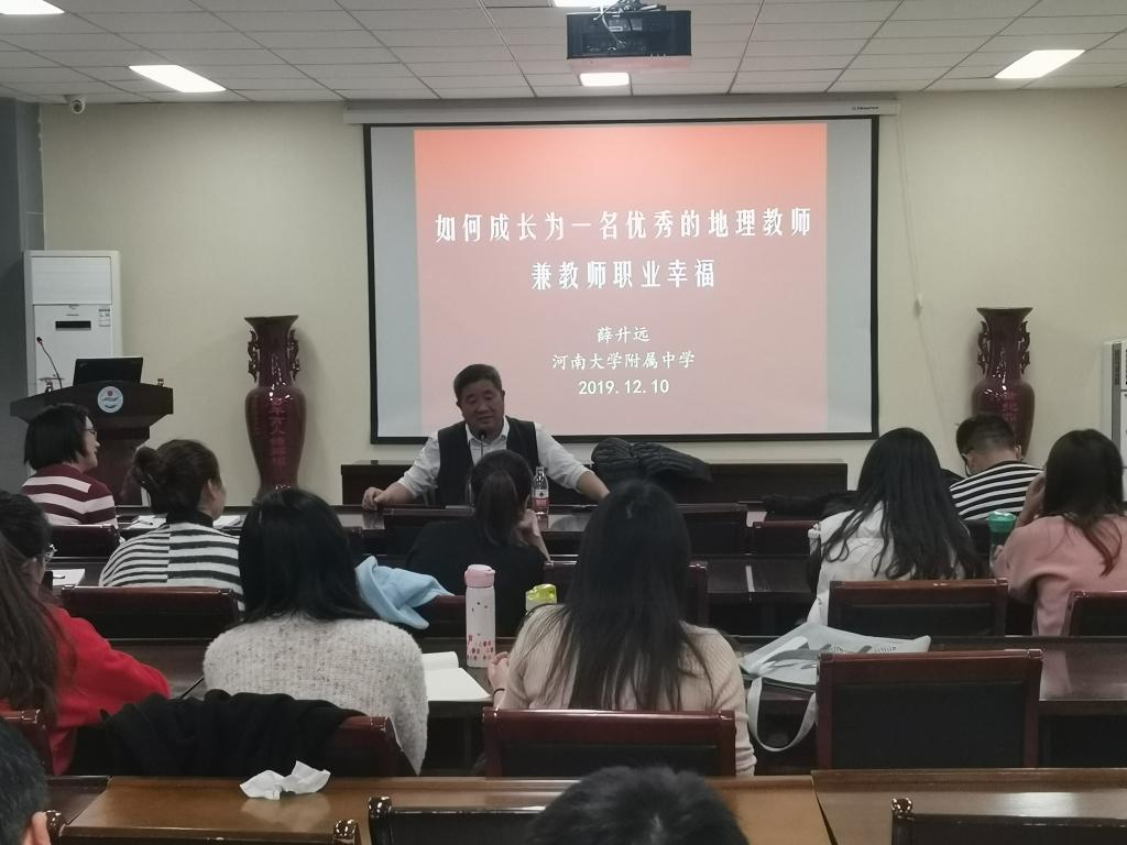 为提高地理本科师范生和学科教学(地理)研究生的职业认同感与职业幸福感,对其学业生涯进行有利的指导与点拨,2019年12月10日我院张广花老师特邀beat365 手机版官方网站附属中学的薛升远教师前来座谈。