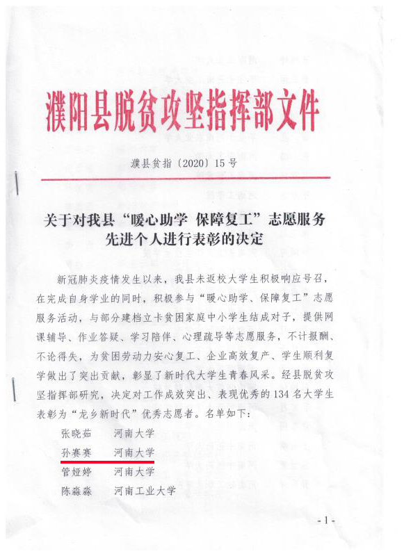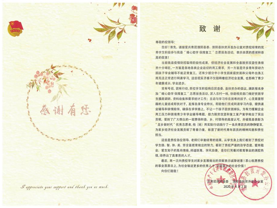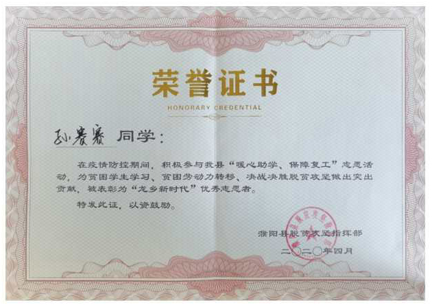 收到濮阳县脱贫攻坚指挥部颁发的荣誉证书的那个晚上,beat365 手机版官方网站环境与规划学院2019级本科生孙赛赛心潮澎湃,一夜未眠——这个与因父母复工而缺乏辅导的孩子们结缘的男孩怎么也没想到,自己的一段志愿经历,竟得到了一份从家乡寄往大学的致谢信。信中,濮阳县政府用“‘龙乡新时代’优秀志愿者”来评价孙赛赛,并对其表示感谢。