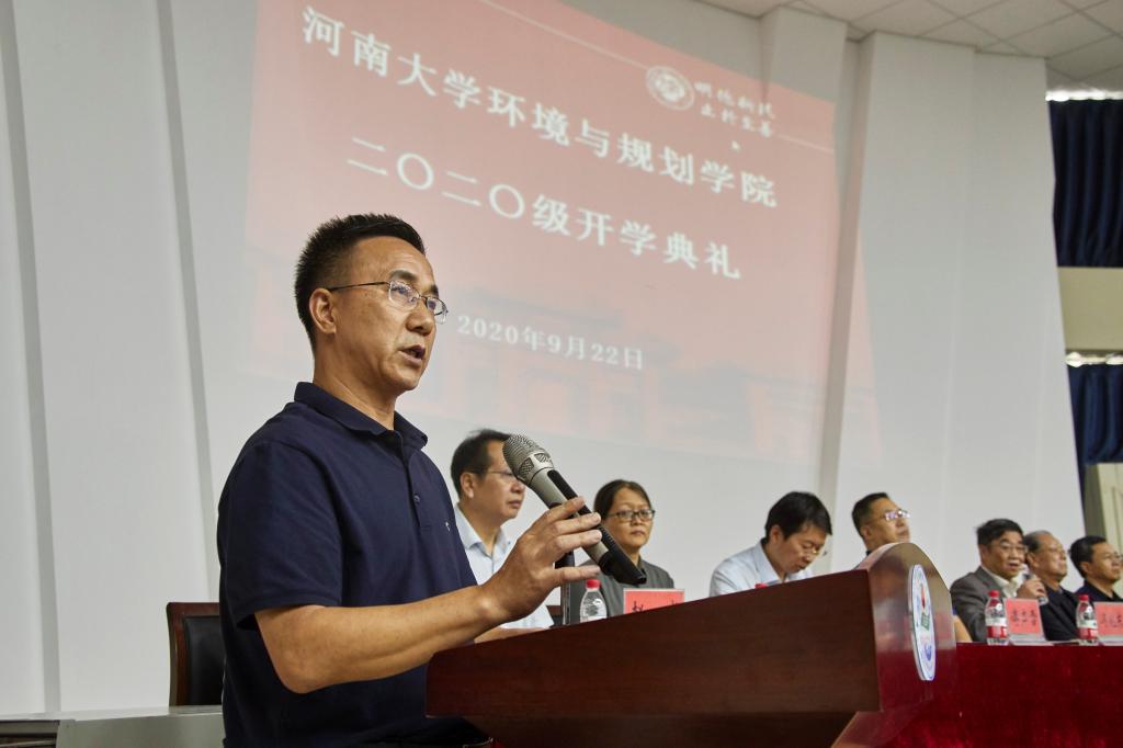 追逐九月的和风,沐浴金秋的阳光。22日下午三点,环境与规划学院2020级新生开学典礼在beat365 手机版官方网站金明校区锥形报告厅一楼举行。环境与规划学院院长、国家杰出青年科学基金获得者、博士生导师傅声雷,beat365 手机版官方网站原副校长、博士生导师王发曾,省特聘教授、博士生导师卢鹤立及相关领导、教师、军训教官和2020级全体新生参加典礼。开学典礼由环境与规划学院党委书记闫峻主持。在威严庄重的国歌声中,新生开学典礼拉开了序幕。首先,院长傅声雷代表学院向全体2020级新生致辞,他细数了学院的光辉历史与前瞻突破,向新生详细介绍了学院的历史改革、学科队伍建设、国际交流与近年来的教学和科研成果。他指出,随着学院国际化水平不断提高,十余位海外讲座教授受聘我院任教,三十余位教师出国访学,学院正向着实现国内双一流、国际有重要影响的研究型特色学院逐步迈进。会上,院长傅声雷与新生进行了亲密互动,表达了对新生殷切的期望,强调新生应当志存高远,脚踏实地,致力于实现人生目标。