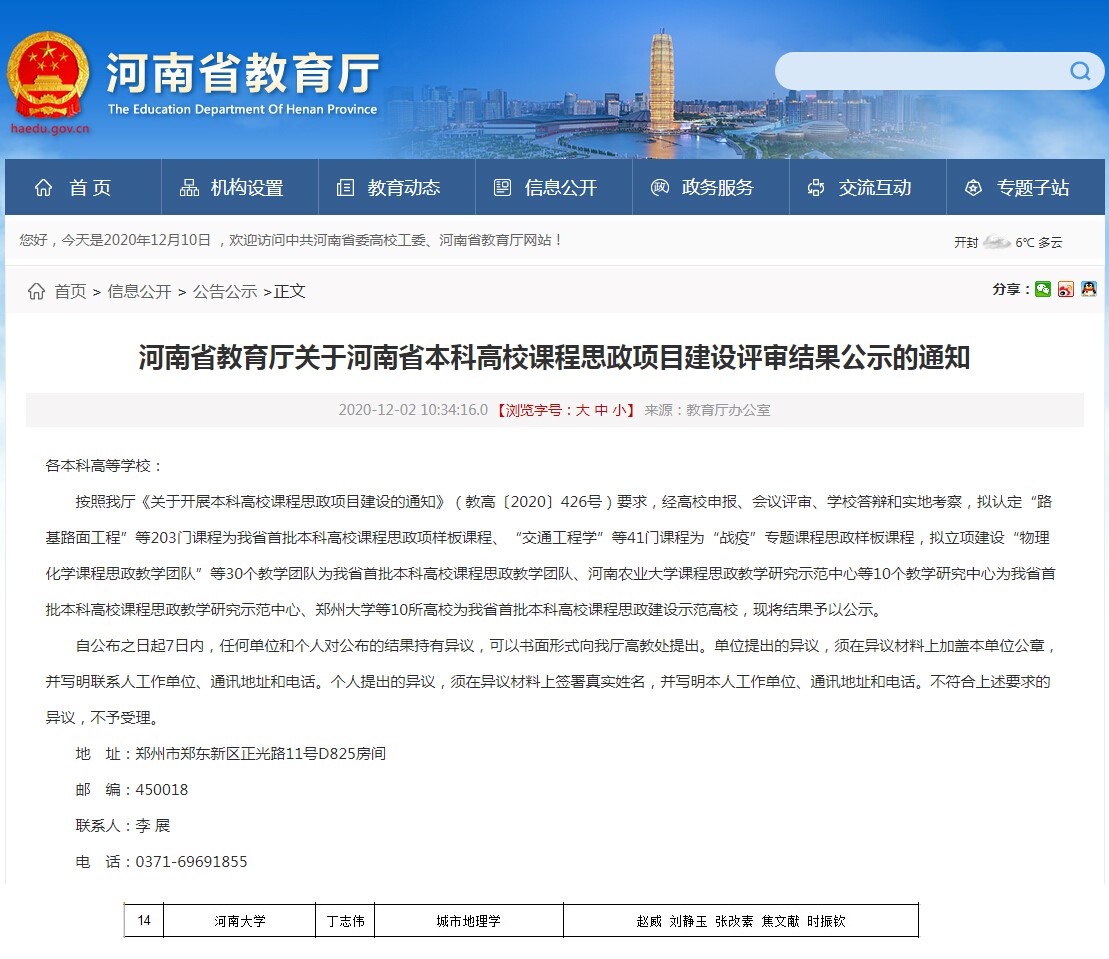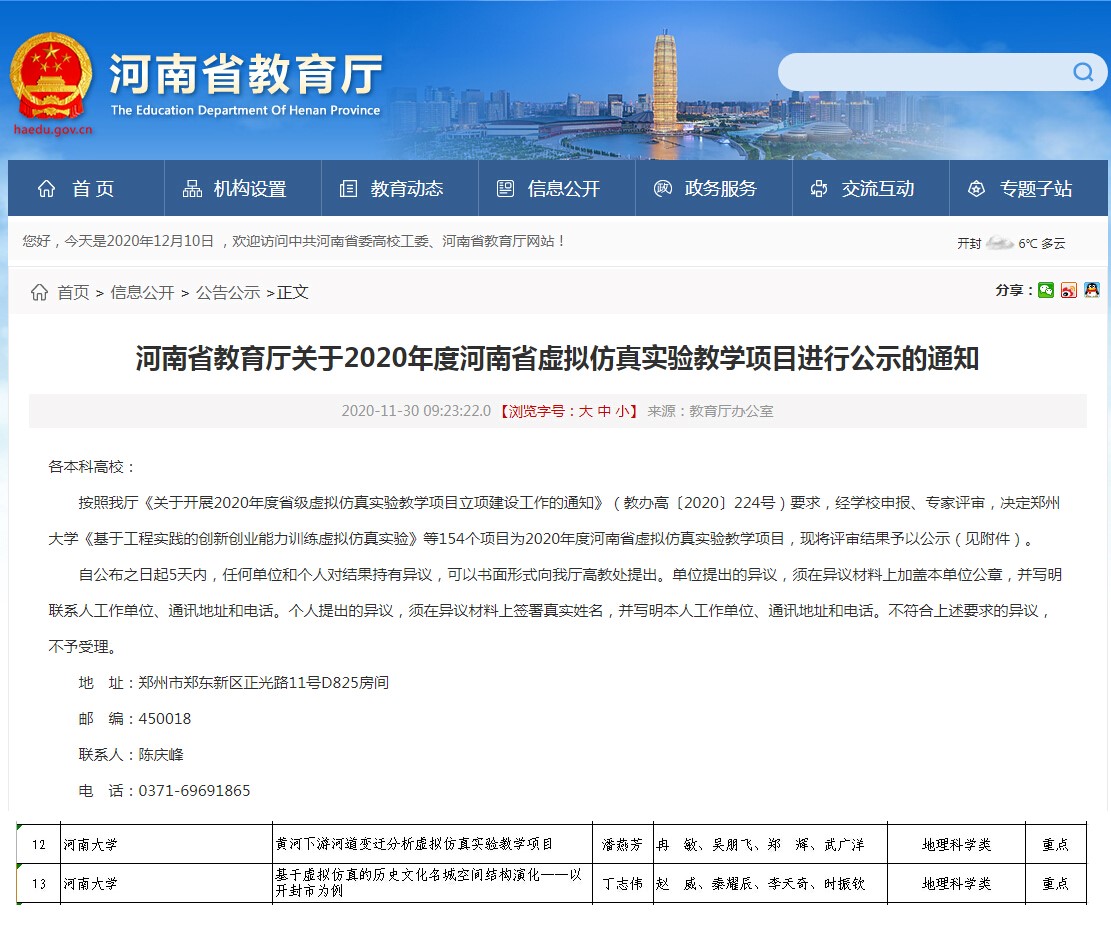 近日,河南省教育厅公布了《关于河南省本科高校课程思政项目建设评审结果公示的通知》和《关于2020年度河南省虚拟仿真实验教学项目进行公示的通知》。我院丁志伟老师的《城市地理学》课程获批河南省首批本科高校课程思政项样板课程,潘燕芳老师的《黄河下游河道变迁分析虚拟仿真实验教学项目》和丁志伟老师的《基于虚拟仿真的历史文化名城空间结构演化——以开封市为例》获批省级重点虚拟仿真项目。