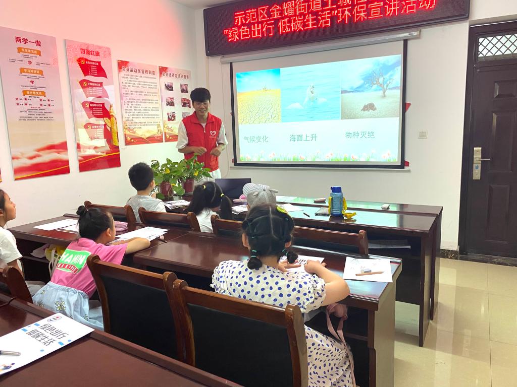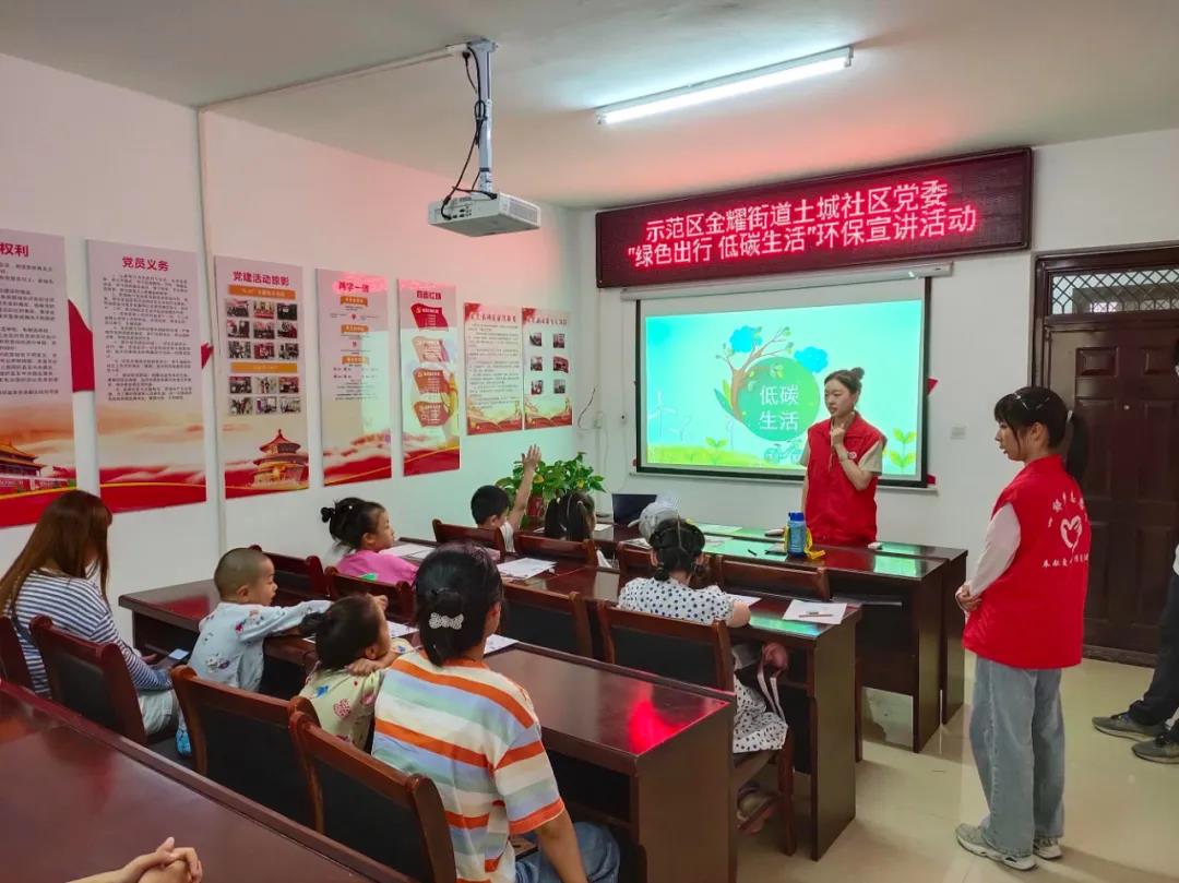 7月16日上午,调研团成员来到示范区金耀街道土城社区,在党支部书记徐璐璐以及社区志愿者接待下,给社区的孩子们带去了一场别开生面的绿色出行科普讲座。