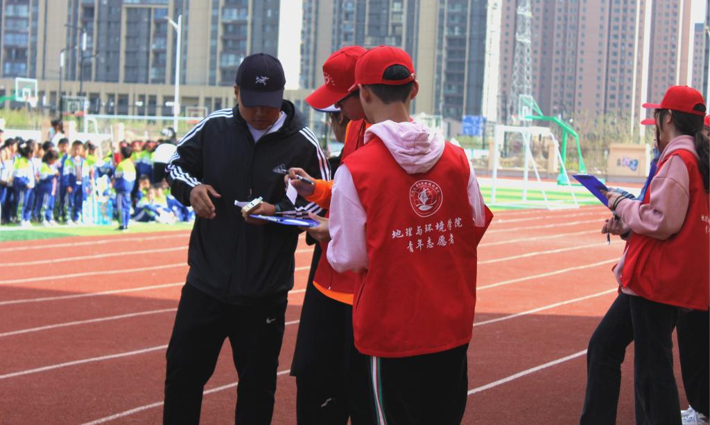 志愿者们根据裁判长的要求分别负责不同的比赛项目,协助完成赛前准备工作、运动员检录与成绩的记录工作。在比赛进行时维护赛场秩序,休息时与小学生们热情交流、友好互动。运动场上处处可见志愿者辛勤工作的身影。他们坚守在自己的岗位上,一丝不苟地完成工作,为小运动员们提供更好的服务。观赛学生忘情地呐喊助威,操场上充满了欢声笑语。活动结束后,志愿者们与河大附小金明校区的教师们合影留念,并进行友好交流。徐凯红热情地邀请志愿者们参观校舍,并介绍其校园建设和校园文化,进一步加强志愿者们与学校的互动,加深志愿者们对学校的了解。