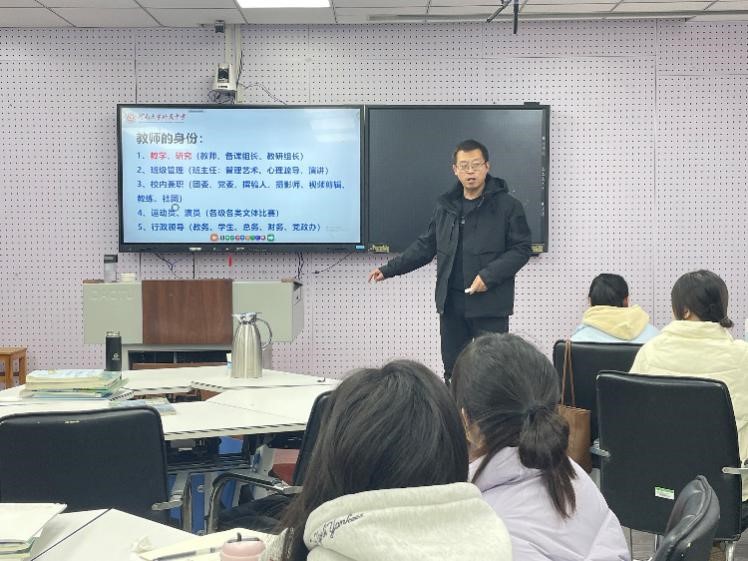 首先,在“当教师,你准备好了吗”部分,丁老师提出教师具有知识传授者、研究者、引导者、班级管理者等多种角色,应充分明确教师角色定位,努力发展自身专业素养,为今后做好教学、研究、班级管理等工作打下坚实基础。其次,在“当教师,要学会做哪些工作”部分,丁老师阐述了教师的日常工作内容,并强调了班主任工作的重要性,鼓励大家今后要勇于承担班主任工作,积极开展教学、实践、社团等校内外活动,践行中国学生发展核心素养指标体系,充分发挥教育的育人功能,立足于我国的教育目的,培养德智体美劳全面发展的社会主义建设者和接班人。最后,在“当好教师,给大家的建议”部分,丁老师希望同学们不仅要当好老师,还要当“好”老师,并结合自身经验和社会要求对我院师范生提出五点建议:业务要精、人缘要好、机会要争、吃亏是福以及多培养特长,争做“有理想信念、有道德情操、有扎实知识、有仁爱之心”的四有好老师。
