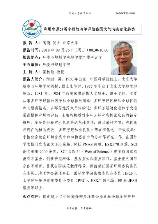 【地学论坛】陶澍:利用高源分辨率排放清单评估我国大气污染变化趋势(时间:9.26,8:30-10:00)