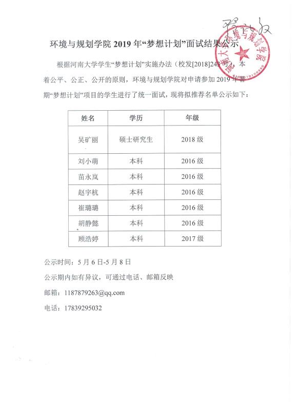 根据beat365 手机版官方网站学生“梦想计划”实施办法(校发[2018]243号),本着公平、公正、公开的原则,环境与规划学院对申请参加2019年暑期“梦想计划”项目的学生进行了统一面试,现将拟推荐名单公示如下